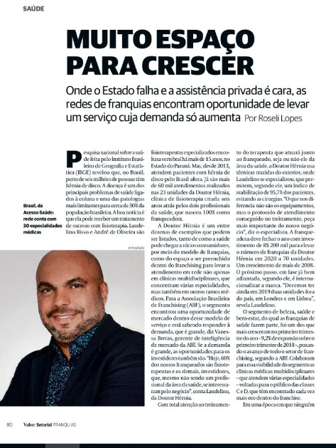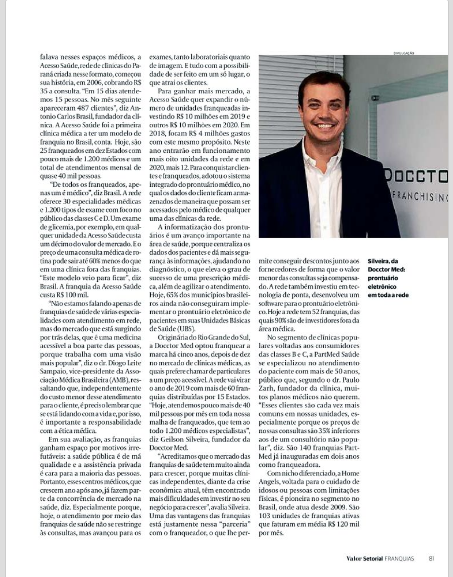 A revista Valor Setorial do jornal Valor Econômico publicou matéria com o Acesso Saúde sobre redes de franquias médicas. O Valor Econômico possui 4.800.000 leitores por mês e possui tiragem diária de 62.000 exemplares