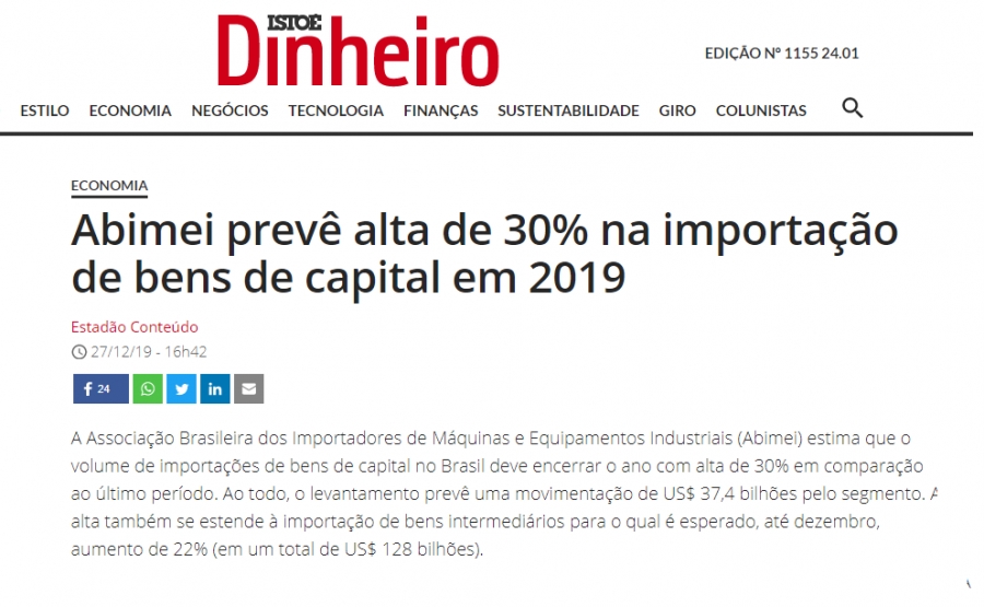 O portal da revista IstoÉ Dinheiro, com mais de 3.000.000 de visitantes, publicou matéria com a Abimei sobre a previsão de alta de 30% das importações de bens de capital para 2019. Confira a matéria na íntegra.