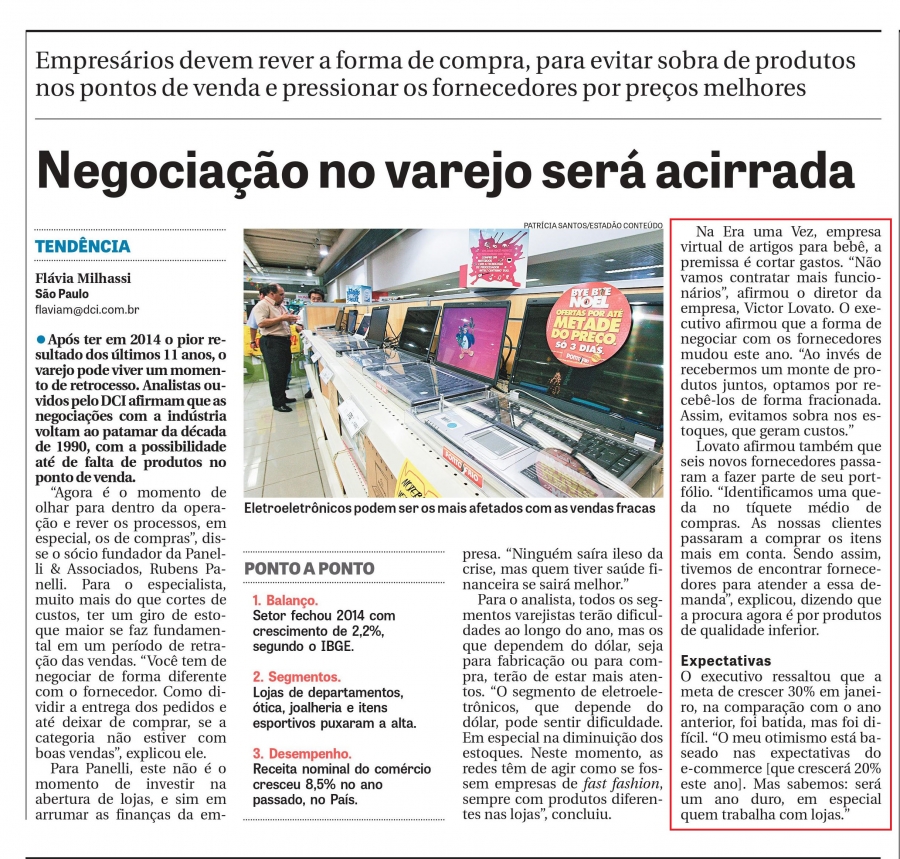 O jornal DCI publicou matéria com a loja Era Uma Vez, sobre as expectativas do setor varejista para este ano, matéria que também foi publicada na internet (para ler é preciso se cadastrar no site). O serviço de assessoria de imprensa da Missão Comunicação foi essencial para conquistar esse espaço.